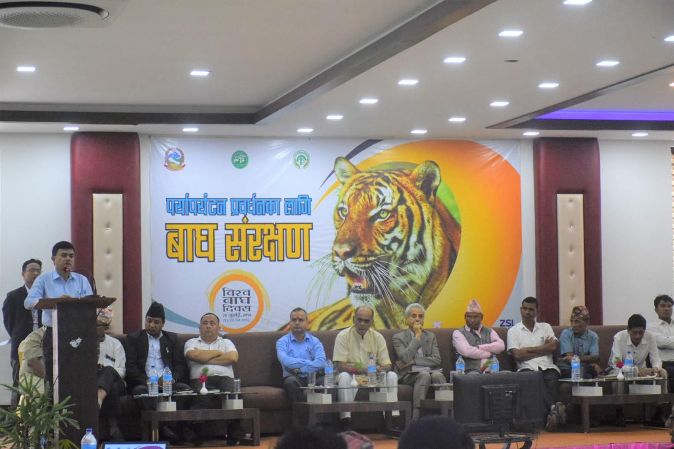 Addressing the event Mr. Ram Chandra Kandel, Deputy Director General of DNPWC delivered his presentation covering the important aspects of tiger conservation in Nepal, further calling on local governments and local communities to take the lead in tiger conservation by driving a balance between conservation and development. Another presentation by Dr. Rajendra K.C, Deputy Director General of DFSC was made focusing on landscape approach to conservation in Nepal, in which he highlighted key issues to deal at the landscape level to sustain growing tiger population. Mr. Man Bahadur Khadka, Director General of DNPWC drew light about the government's close attention to reduce human-wildlife conflicts and also reframe policies so as to acquire conservation benefits. A study to set the measurable conservation targets that help in sustaining growing tiger population is already underway.