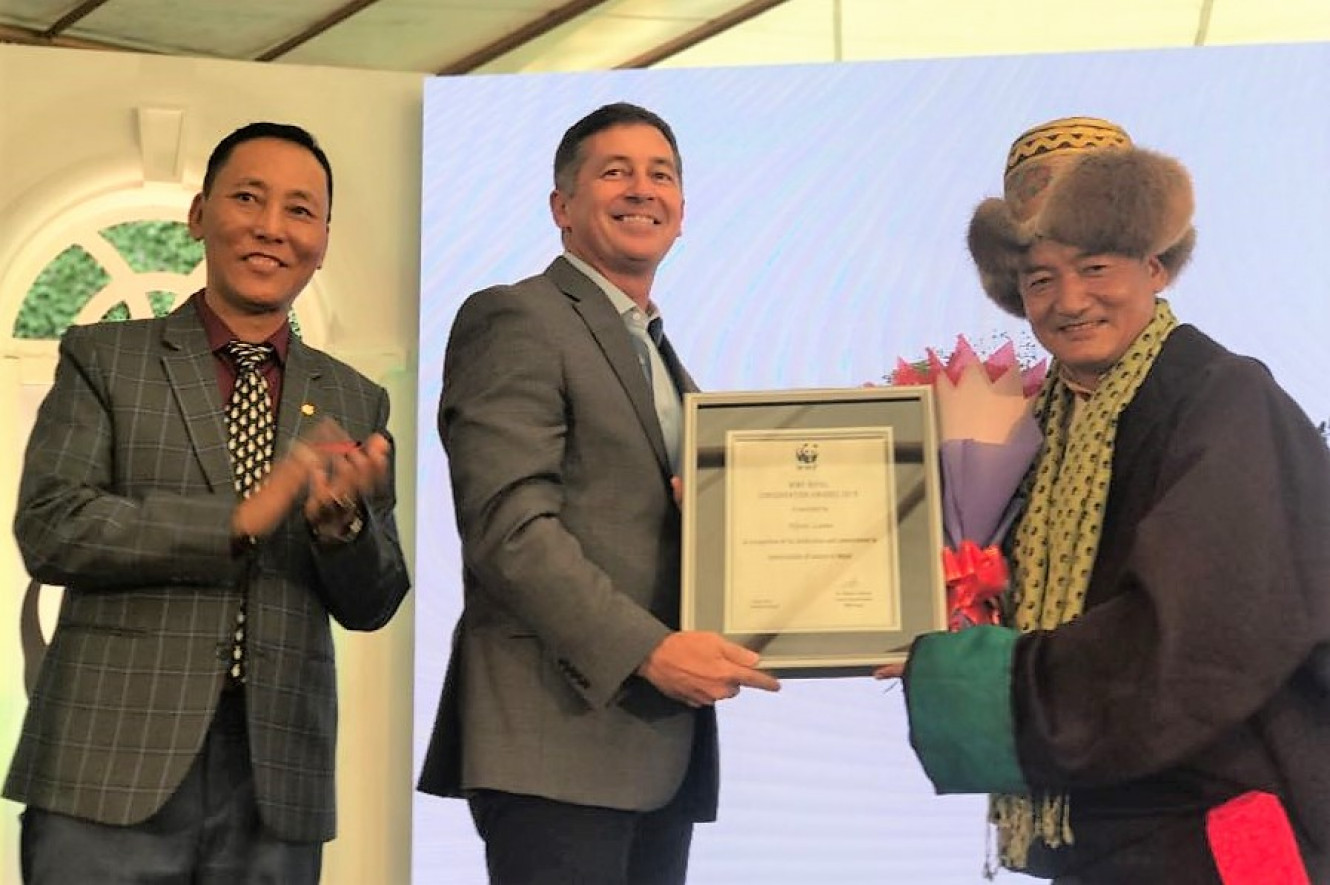 Among five recipients of the WWF Nepal Conservation Award 2019—comprising of three individuals and two community organizations—Mr. Nima Lama from the Sakya Committee Anti-poaching Unit in the Manaslu Conservation Area were awarded with recognitions for their grassroots initiatives in country's conservation success by H.E. Mr. Randy W. Berry, U.S. Ambassador to Nepal.