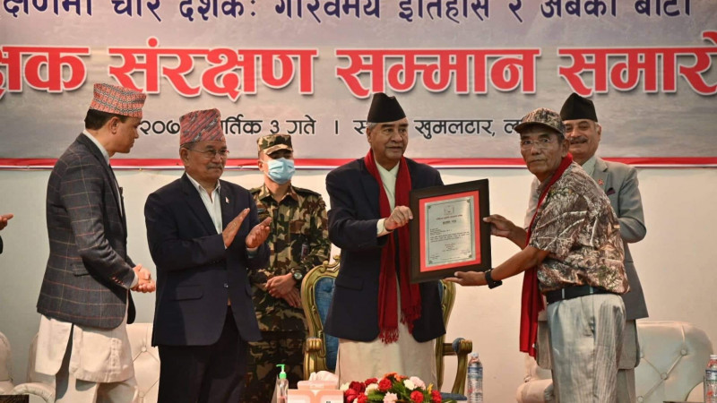 In addition to the "NTNC - Patron Conservation Award", eleven more recognitions were awarded by the Prime Minster to institutions and individuals making remarkable contributions for conservation. They included three awards to government institutions—the Department of National Parks and Wildlife Conservation (DNPWC), the Department of Forests and Soil Conservation (DFSC), and the National Park and Wildlife Conservation Directorate of the Nepal Army; three awards to conservation organizations—WWF Nepal, ZSL Nepal, and IUCN Nepal; three awards to community-based conservation institutions—CAMC Chhoser from Annapurna Conservation Area, CAMC Chumchet from Manaslu Conservation Area, and CAMC Alampu from Gaurishankar Conservation Area; plus two individual awards given to Mr. Devi Prasad Ghimire, advisor of Friends of Zoo (FoZ) committee, and Mr. Chungba Sherpa, wildlife photographer.